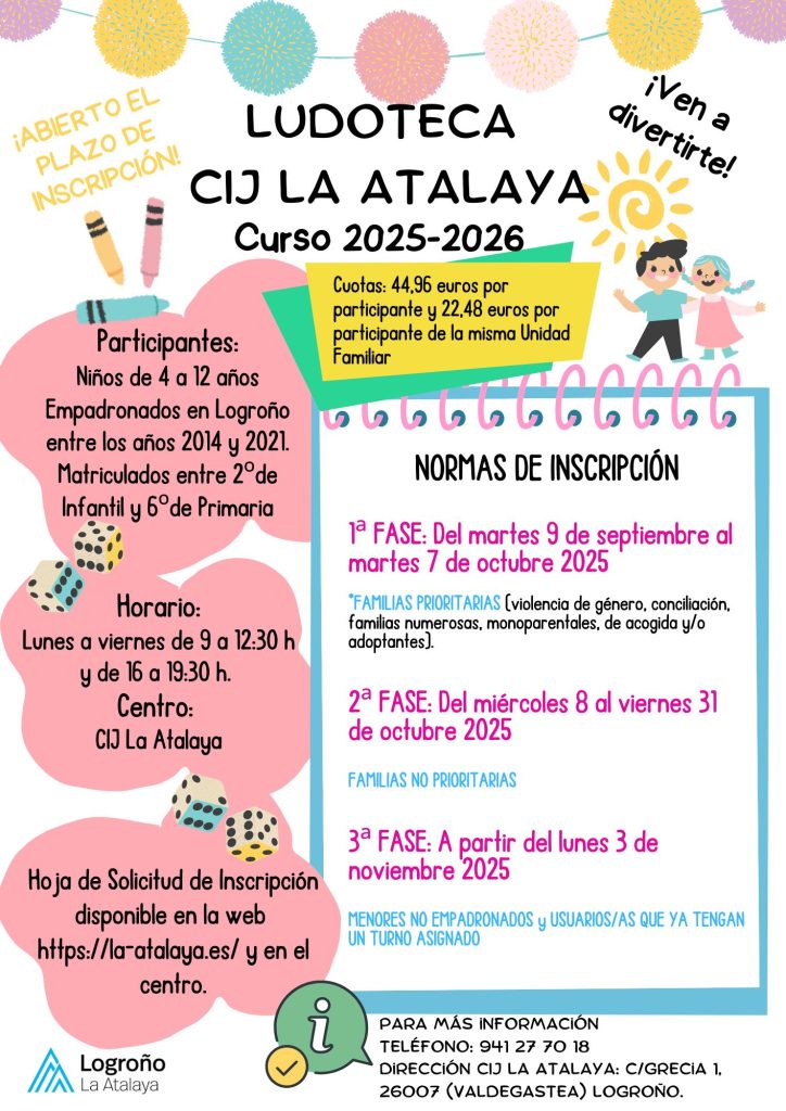 - Ludoteca Abierta: Las inscripciones se realizarán por orden de llegada hasta completar aforo los sábados.